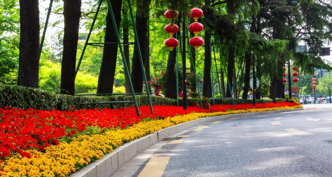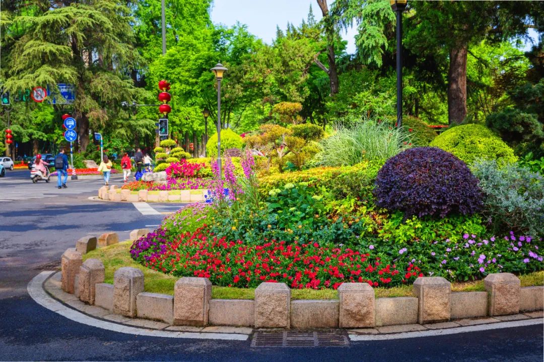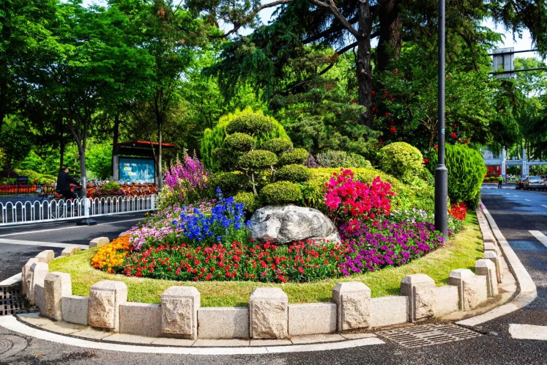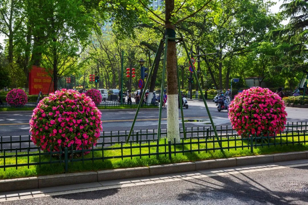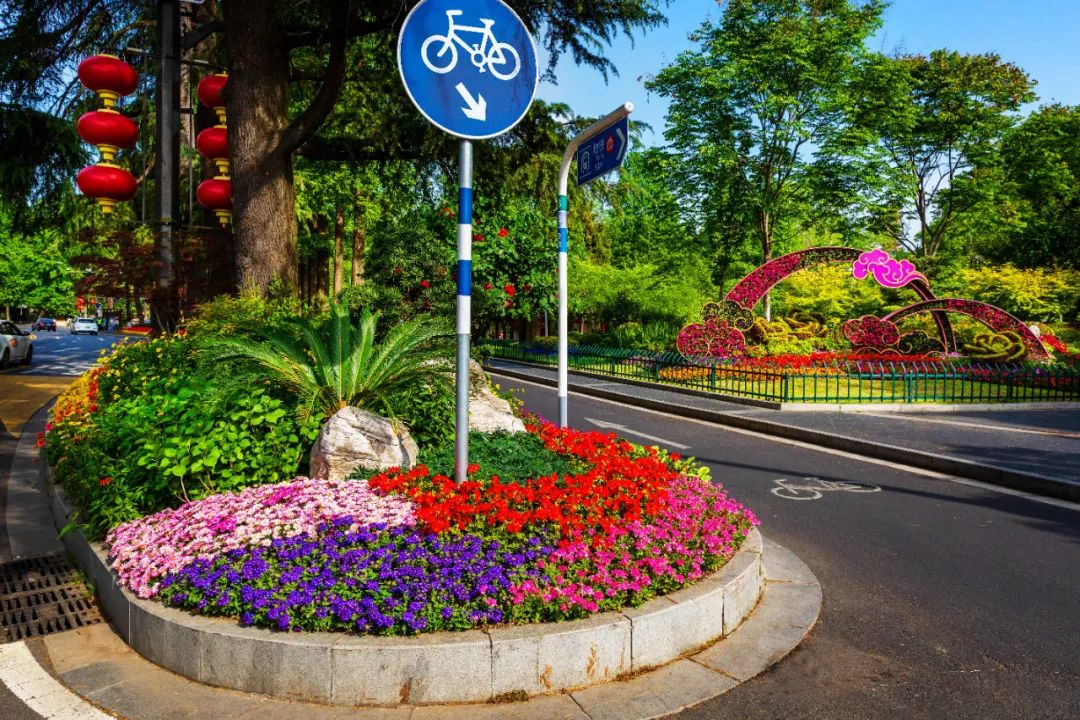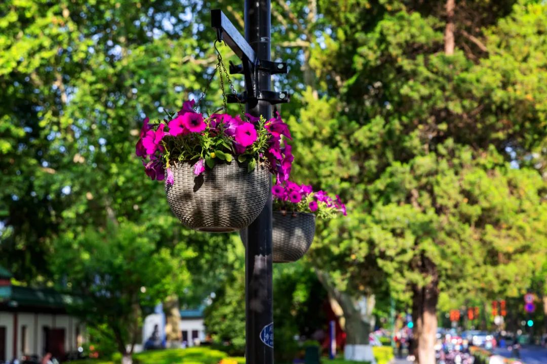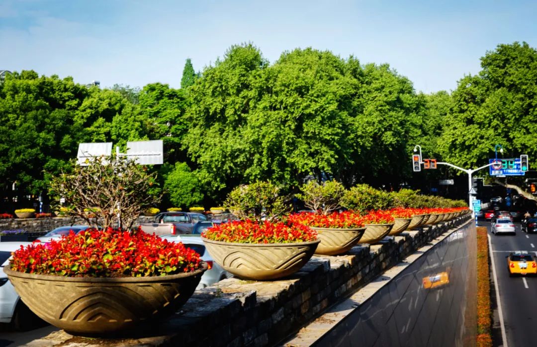 對(duì)市府門前路、長(zhǎng)江路、九華山站、荔枝廣場(chǎng)、中山門城墻等重要節(jié)點(diǎn)容器花箱、花球、燈桿掛花及新街口東北角綠地進(jìn)行花卉布置,選用朱蕉、羽扇豆、毛地黃、天竺葵、桑貝斯鳳仙、金雀、澳洲朱蕉、變?nèi)~木、四季海棠、鼠尾草、歐石竹、垂掛牽牛等花卉,以色彩鮮明、層次豐富的設(shè)計(jì)感,裝扮城市街角,營(yíng)造濃厚的節(jié)日氣氛。