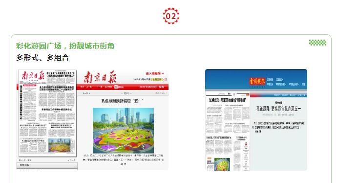鼓樓中心廣場(chǎng)孔雀綠雕換上新妝、“五福梅花”和12個(gè)錯(cuò)落的幸?;ㄇ蛞陨是逍碌幕ɑ懿贾?,營(yíng)造出“‘梅’好金陵”的春天氣息。4月25日,《南京日?qǐng)?bào)》、《金陵晚報(bào)》等多家媒體對(duì)鼓樓中心廣場(chǎng)孔雀綠雕迎五一換妝進(jìn)行報(bào)道。