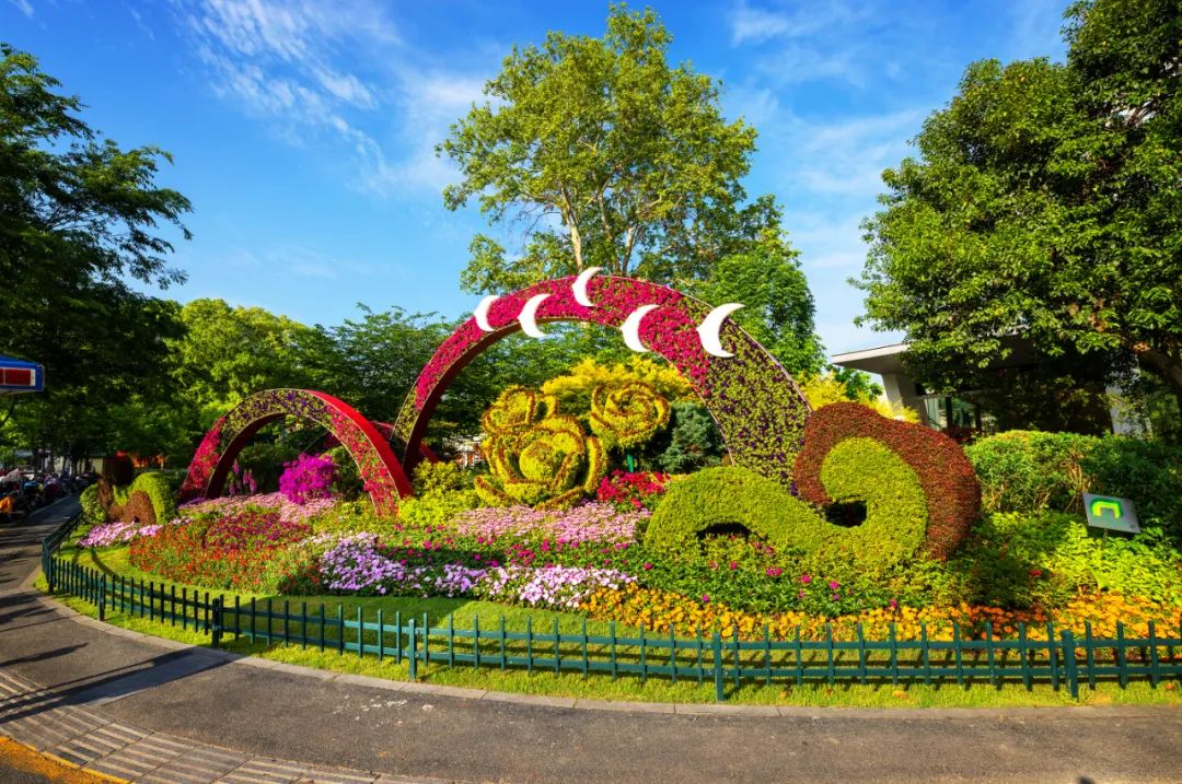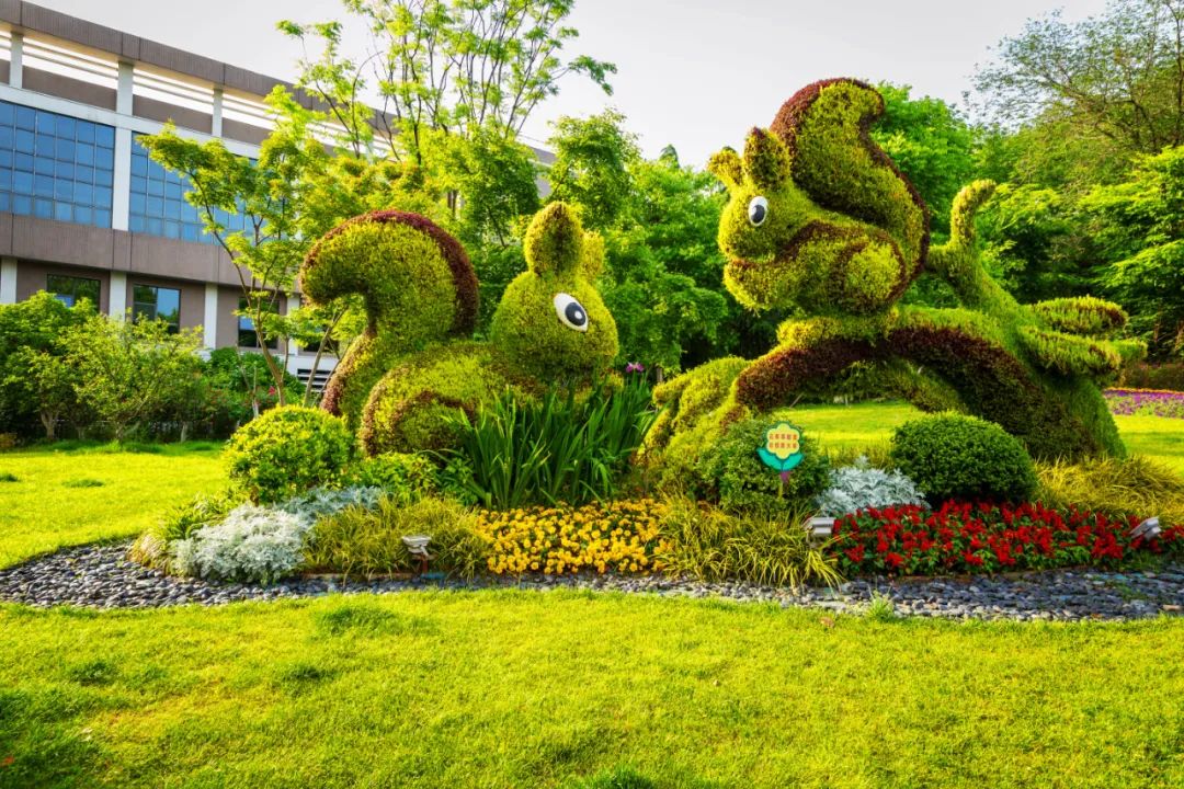 和平公園東園“幸福之門”、西園“飛躍之門”、九華山南坡松鼠等綠雕花境布置,花姿招展、層次錯(cuò)落的空間感和情景變化,步移景異、栩栩如生。